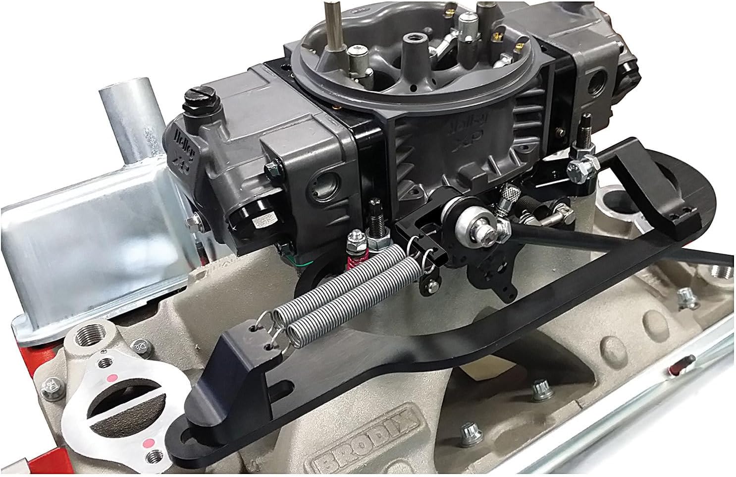 Black anodized aluminum bracket fastens to the carburetor mounting studs and features a larger opening specifically designed for use with mechanical linkage found on many circle track cars. The larger opening allows throttle linkage to be routed from underneath to help prevent clearance or interference issues. Dual return springs are connected to a universal return spring bracket to work with most carburetors. Brackets include a built-in adjustable throttle stop to help prevent damage to carburetor.