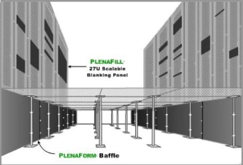 PlenaForm is a flexible, snap together, air flow baffle system which helps to solve dynamic thermal imbalances under the raised floor in data centers. The system guides cold air to where it is needed, while keeping it “fenced” in using under-floor barriers. Flame-retardant baffles are scored both vertically and horizontally so sections can be removed or added onto to meet any height or width requirement. All angles of bend radius may be attained, including inside and outside mounting to raised floor pedestals. It has a continuous punch out hole pattern which allows attachment to any style raised floor pedestal at any height or width location with cable ties. Baffle size: 24"H x 48" W x .040"D Kit includes 12 baffles, 88 cable ties and 44 rivets.