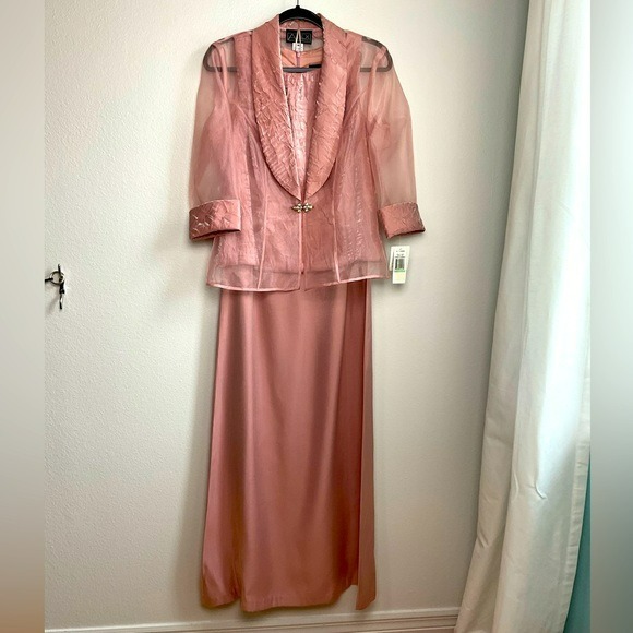 The top of this sleeveless gown is a crinkly fabric with a blouson effect and the skirt is a beautiful fall of smooth pink shimmery fabric.
