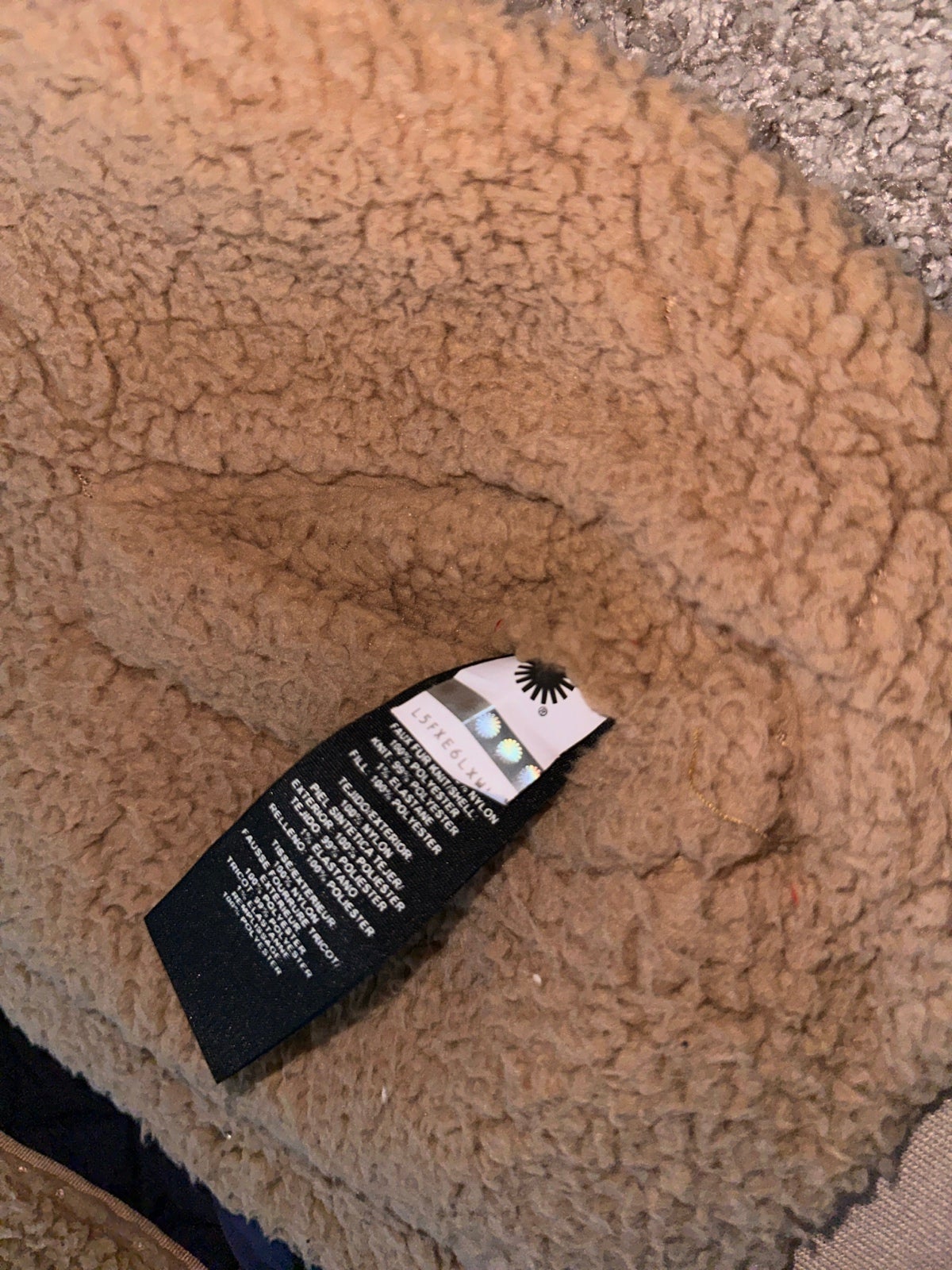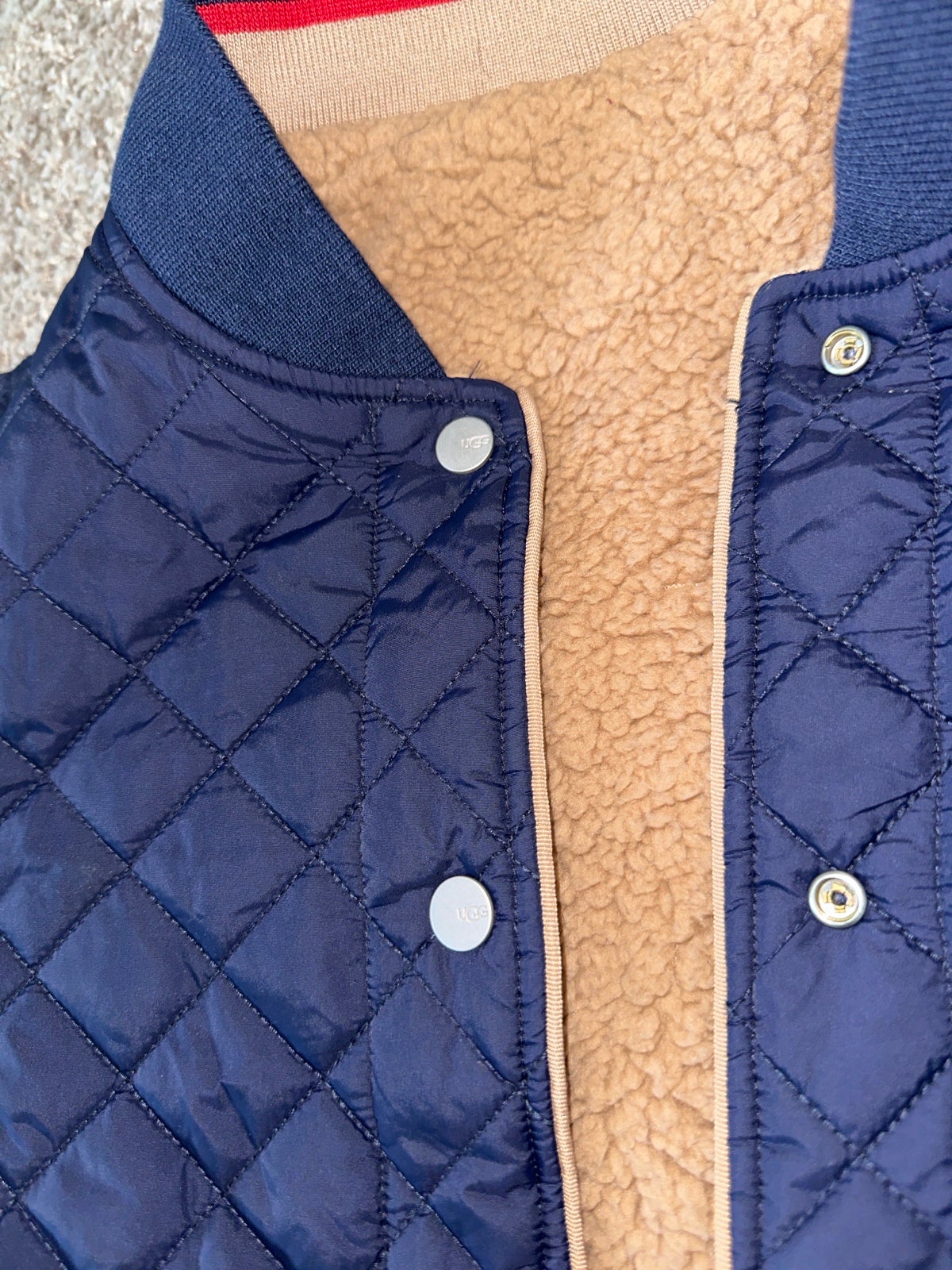 I have a UGG RTW reversible jacket, Navy Blue Nylon checkered pattern one side and UGG iconic Chestnut colorway in soft Sherpa on the reverse side, match with your favorite pair of UGG footwear the size says small but it may fit a medium with nothing too heavy underneath.