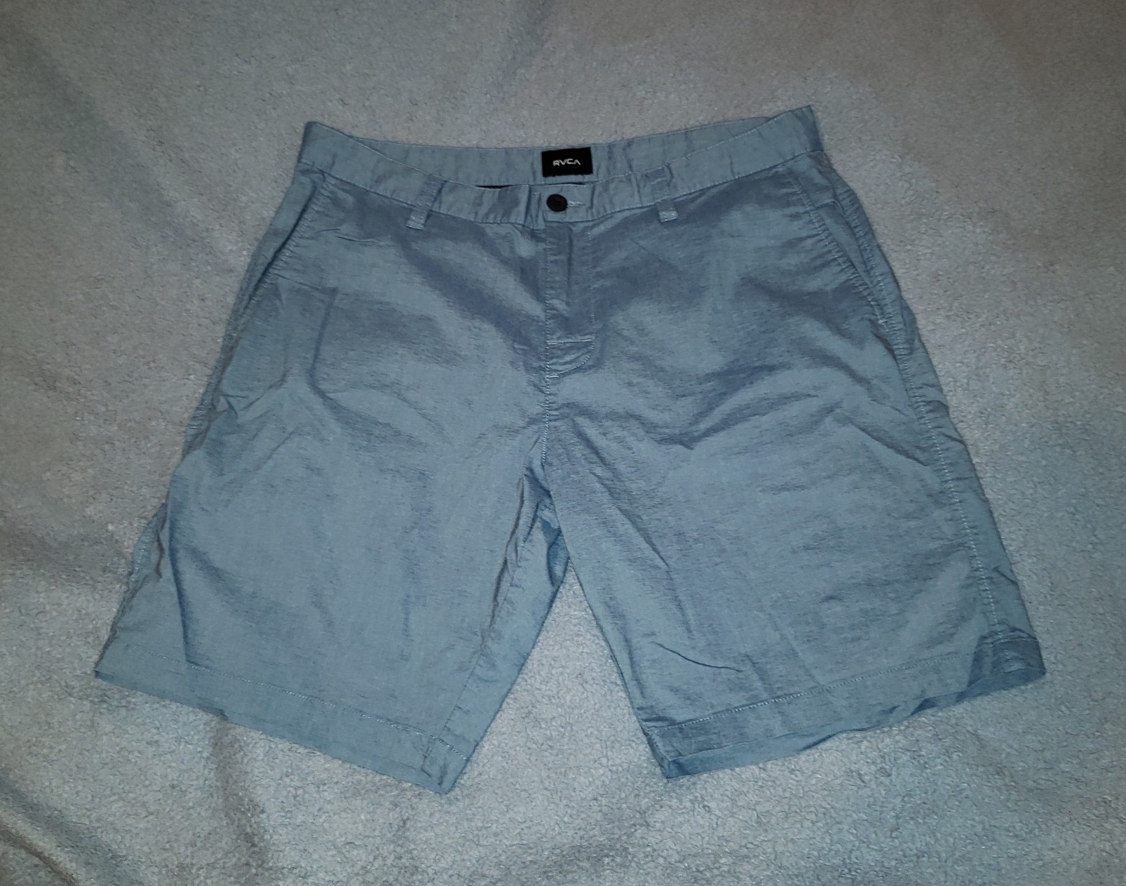 RVCA VA Balance Hybrid Men's Shorts. Blue Jade colorway. Men's waist size 34. Made of 4-way stretch blended fabric, these 20" hybrid shorts feature a durable, water-resistant finish to keep you comfortable and dry. This versatile design is styled with a fly-and-button closure and pockets. Cotton/Polyester/Elastane blend. Excellent condition.