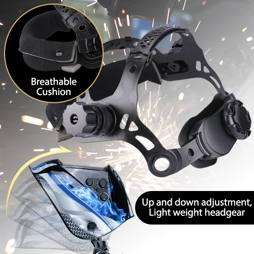 * Auto-Darkening Welding Helmets is designed & equipped with a special turnover(up & down)headband mechanism. When welder turns over the helmet to welder's head top, the headband mechanism makes helmet's gravity center to be more lower, and be coincided with the center of welder’s head. The design of welding helmet greatly lowers the fatigue of welder’s head(& neck)and make welder feel more comfortable than before while at working.